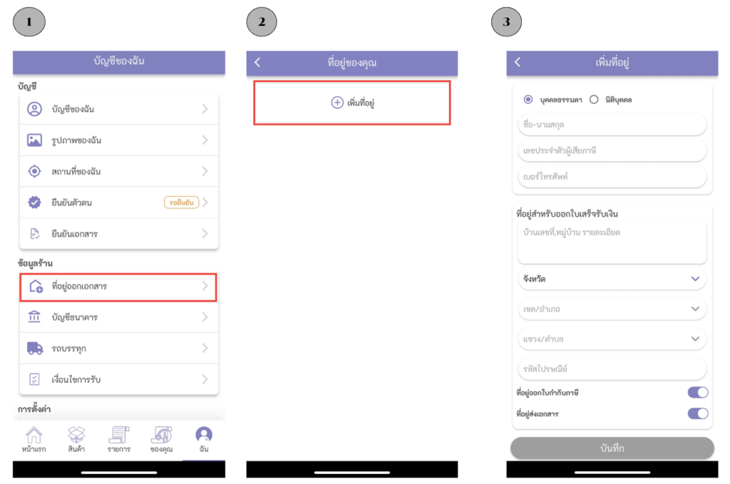 1.หลังจากเข้าสู่ระบบ ให้เลือก “ฉัน” และเลือก “ที่อยู่ออกเอกสาร”